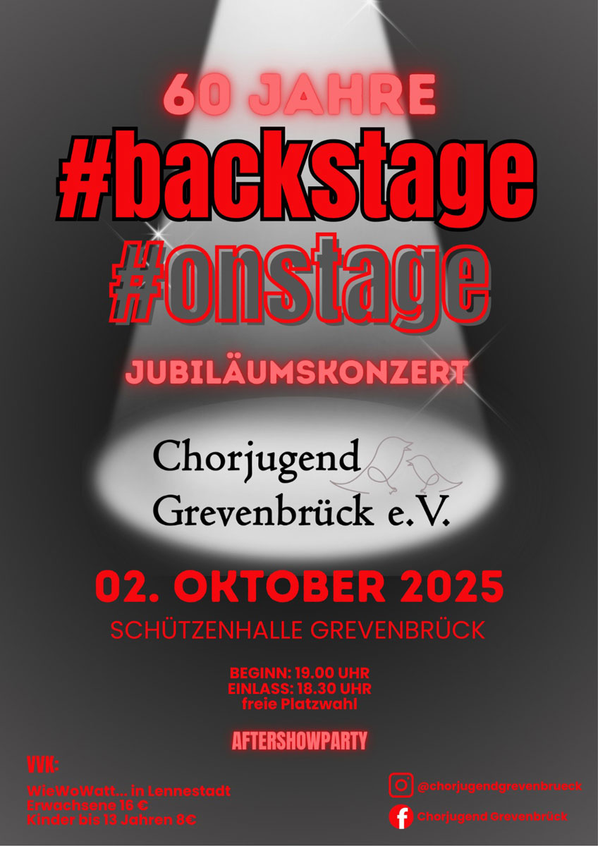 Die Chorjugend Grevenbrück feiert bald großen Geburtstag – schon 60 Jahre lang wird hier mit viel Freude und Begeisterung gesungen. Zu diesem Anlass findet am 02.10.2025 um 19 Uhr ein Konzert in der Schützenhalle Grevenbrück statt, in welchem die Chorjugend Grevenbrück gemeinsam mit allen Besucherinnen und Besuchern die vergangenen Jahre Revue passieren lässt. Es wird ein spannender und kreativer Programmabend, der viele Überraschungen bereithält.